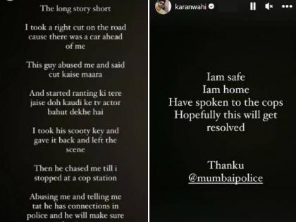 अनेकदा सेलिब्रिटींसोबत अनोळखी लोक विचित्र वागताना दिसतात. कधीकधी नाहक त्रासही देतात. नुकतंच करण वाहीलाही असाच अनुभव आला असून त्याने संपूर्ण घटना सोशल मीडियावर शेअर केली आहे. कारमधून घरी जाताना त्याच्यासोबत विचित्र घटना घडली. तो लिहितो, "कारमधून जात असताना मी उजवा कट घेतला कारण माझ्यासमोर एक कार होती. तेवढ्यात स्कुटीवरील एक माणूस आला आणि मला शिव्या द्यायला लागला. कट कसा मारलास असं तो म्हणत होता. तुझ्यासारखे दोन पैशाचे बरेच टीव्ही अभिनेते पाहिले आहेत. मी त्याच्या स्कुटीची चावी घेतली, नंतर त्याला परत दिली आणि तिथून निघालो."