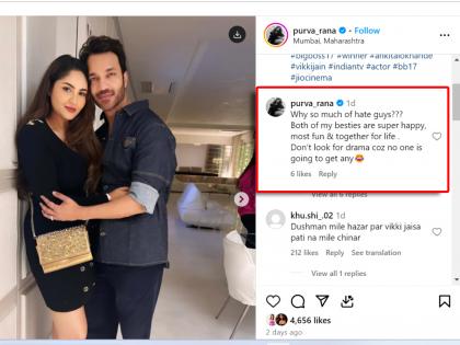 पूर्वा राणाने तिच्या इन्स्टाग्रामवरुन विकीसोबतचा एक फोटो शेअर केला आहे. या फोटोमध्ये विकी राणाबरोबर पोझ देताना दिसत आहे. त्याचा हा फोटो पाहून चाहते अवाक् झाले आहेत. या फोटोवर कमेंट करत चाहत्यांनी त्यांना ट्रोल केलं आहे. "ज्याची भीती होती तेच झालं अंकिता", अशी कमेंट एकाने केली आहे. तर दुसऱ्याने "आणि याच्या आईला वाटतं माझा मुलगा काहीच करत नाही", असं म्हटलं आहे. "अंकिता लोखंडे बिग बॉस १७मध्ये रडत असेल", अशी कमेंटही केली आहे. "म्हणून अंकिता नेहमी चिंतेत असते," असंही एका नेटकऱ्याने म्हटलं आहे.
