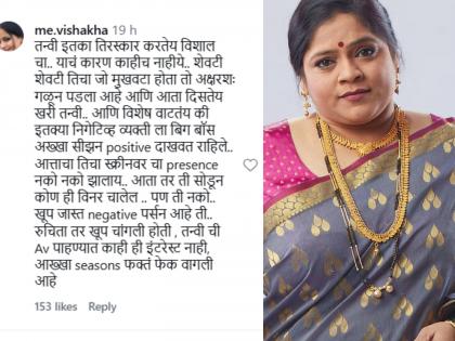 तन्वी कोलतेसंदर्भात नुकतीच किरण मानेंनी एक पोस्ट लिहिली होती. त्यात त्यांनी तन्वीवर टीका करत त्यांच्या सीझनवेळी अपूर्वा नेमळेकरसोबतचा झालेला वाद आणि नंतर झालेला बाँड याबद्दल लिहिलं होतं. त्या पोस्टवर अभिनेत्री विशाखा सुभेदारने कमेंट करत लिहिले, "तन्वी इतका तिरस्कार करतेय विशालचा. याचं कारण काहीच नाहीये. शेवटी शेवटी तिचा जो मुखवटा होता तो अक्षरशः गळून पडला आहे आणि आता दिसतेय खरी तन्वी.. आणि विशेष वाटतंय की इतक्या निगेटिव्ह व्यक्तीला बिग बॉस अख्खा सीझन पॉझिटिव्ह दाखवत राहिले. आत्ताचा तिचा स्क्रीनवरचा प्रेझेन्स नको नको झालाय. आता तर ती सोडून कोणीही विजेता चालेल..पण ती नको. खूप जास्त निगेटिव्ह व्यक्ती आहे ती.. रुचिता तर खूप चांगली होती तन्वीची Av पाहण्यात काहीही इंटरेस्ट नाही. अख्खा सीझन फक्त फेक वागली आहे."