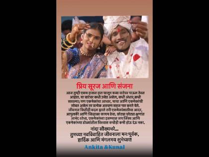 अंकिताने सूरज आणि संजनासाठी खास पोस्ट शेअर केली आहे. "प्रिय सूरज आणि संजना, आज तुम्ही एकत्र हातात हात घालून नव्या वाटेवर पाऊल ठेवत आहात. या वाटेवर कधी उजेड असेल, कधी अंधार, कधी सावल्या, पण एकमेकांचा आधार, माया आणि एकमेकांची सोबत असेल तर प्रत्येक अडचण सहज पार करता येते. जीवनात कितीही बदल झाले तरी एकमेकांसाठीचा आदर, आपुलकी आणि जिव्हाळा कायम ठेवा. छोट्या छोट्या क्षणांत आनंद शोधा, एकमेकांच्या हसण्यात जग जिंका आणि एकमेकांच्या डोळ्यांतील विश्वास कधीही कमी होऊ देऊ नका. नांदा सौख्य भरे... तुमच्या नवविवाहित जीवनाला मन:पूर्वक, हार्दिक आणि मंगलमय शुभेच्छा", असं अंकिताने पोस्टमध्ये म्हटलं आहे.