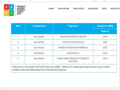 गेल्या अनेक आठवड्यांपासून ब्रॉडकास्ट ऑडियन्स रिसर्च काऊन्सिल इंडियाच्या पहिल्या पाच भागात झी वाहिनीवरीलच या मालिकांनी आपले वर्चस्व निर्माण केले आहे.