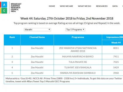 ब्रॉडकास्ट ऑडियन्स रिसर्च काऊन्सिल इंडियाच्या रिपोर्टनुसार यंदाच्या आठवड्यात झी मराठी उत्सव नात्याचा पुरस्कार २०१८ या कार्यक्रमाने बाजी मारली आहे.