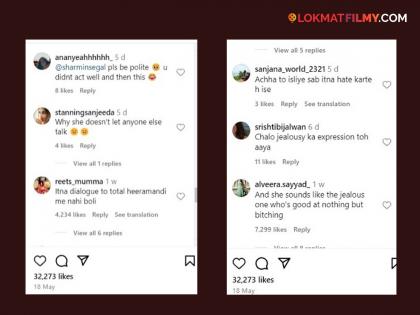 शर्मिनचं हे वाक्य ऐकल्यानंतर नेटकऱ्यांनी तिच्यावर टीकास्त्र डागलं आहे. ''अरे देवा, ही किती द्वेष करतीये. अदितीसोबत स्वत:ची तुला करायला लागलीये पण हिला तर साधा अभिनय सुद्धा येत नाही'', असं एका युजरने म्हटलं आहे. तर, "एवढे डायलॉग्स तर तू संपूर्ण हिरामंडीमध्येही बोलले नसतील", असं अन्य एका युजरने म्हटलं आहे. "ही एवढी का ओरडून बोलतीये, अभिनयासोबतच हिला जरा बोलण्याची पद्धतही शिकवायला हवी", "आपल्यापेक्षा सिनिअर कलाकारांचा मान राखणंही गरजेचं असतं. हिला पाहून सोनम कपूरची आठवण येतीये मला", असं म्हणत नेटकऱ्यांनी तिला चांगलं ट्रोल केलं आहे.