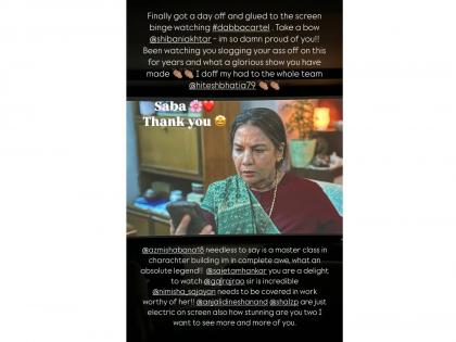 'डब्बा कार्टेल' पाहिल्यानंतर सबा आजाद थक्क झाली आहे. तिने सोशल मीडियावर पोस्ट शेअर करत वेब सीरिजमधील कलाकारांचं कौतुक केलं आहे. तिने सईच्या कामाचंही कौतुक या स्टोरीमध्ये केलं आहे. "फायनली मला एक दिवस सुट्टी मिळाली आणि मी 'डब्बा कार्टेल' ही वेब सीरिज पाहिली. शिबानी दांडेकर मला तुझा अभिमान आहे. हितेश भाटिया आणि संपूर्ण टीमला माझा सलाम! शबाना आझमी तुम्ही पात्र उभं करण्यात मास्टर आहात. तुम्ही लिजंड आहात. सई ताम्हणकर तुला बघणं म्हणजे आनंद आहे. गजराज राव सर तुम्ही कमाल आहात. निमिशाने उत्तम काम केलं आहे. अंजली आणि शालिनी तुम्ही कमाल काम केलं आहे. तुम्हाला अजून स्क्रीनवर पाहायला आवडेल", असं सबाने पोस्टमध्ये म्हटलं आहे.