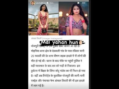 सोशल मीडियावर सध्या 'पंचायत 2' फेम भोजपुरी अभिनेत्री आंचल तिवारी हिच्या निधनाची बातमी वाऱ्यासारखी व्हायरल होत आहे. बिहारजवळील एका गावानजीक झालेल्या भीषण अपघातामध्ये आंचलचा मृत्यू झाल्याचं म्हटलं जात आहे. परंतु, या अपघातात आंचला मृत्य़ू झाला नसून ती सुखरुप आहे. याविषयी स्वत: आंचलने पोस्ट शेअर करत माहिती दिली आहे.