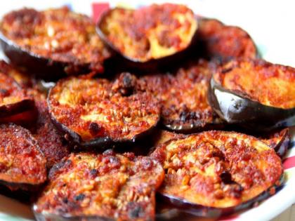 कॉर्नफ्लोअर, तिखट, मीठ, एक चमचा तांदुळाचे पीठ एकत्र करून पातळ घोळ करावा. मोठी वांगी गोल चकत्यांमध्ये कापून पाण्यात टाकावी. एकेक चकती पिठात घोळवून तव्यावर शॅलो फ्राय करावी. सर्व्ह करताना वरून थोडासा चाट मसाला भुरभुरावा.