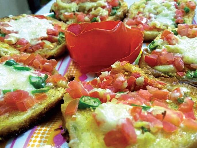 - एका प्लेटमध्ये काढून त्यावर बारीक चिरलेली मिरची, बारीक चिरलेला टॉमेटो, बारीक चिरलेली रंगीत शिमला मिरची, किसलेले चीझ, चवीनुसार मीठ व आमचूर पावडर (चिमूटभर) भुरभुरून हे ब्रेडचे टॉपिंग स्लाइस तयार करून घ्यावे.