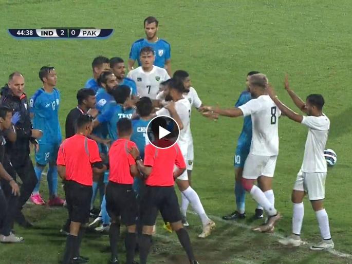 भारतीय संघाने SAFF चॅम्पियनशीपच्या पहिल्याच सामन्यात कट्टर प्रतिस्पर्धी पाकिस्तानला धुतले. भारतीय संघाचा कर्णधार सुनील छेत्री याने ( Sunil Chhetri ) हॅटट्रिक नोंदवून पाकिस्तानला एकहाती धुतले. उदांता सिंगने निर्धारीत वेळेत आणखी एक गोल करून भारताचा ४-० असा दणदणीत विजय निश्चित केला. दरम्यान, या सामन्यात पाकिस्तानी खेळाडू अन् भारतीय खेळाडूंमध्ये वादावादी झाल्याचे पाहायला मिळाले.