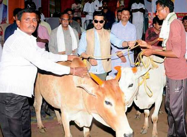 अहेरी येथील दानशूरचा राजा गणेश मंडळ व विश्व हिंदू परिषदेच्या वतीने यावर्षी अभिनव व सामाजिक उपक्रम राबवून १२ गरजू व गरीब शेतकºयांना मोफत बैलजोडी व गायींचे वाटप केले.