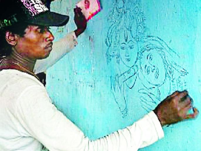 संडे अँकर । अनेकांच्या घरावर दिसते कलाकृती; चित्रांनी निर्माण केली स्वत:ची ओळखप्रदीप बोडणे ।लोकमत न्यूज नेटवर्कवैरागड : चार वर्ग शिकून अक्षर ओळख असलेला डोंगरगाव येथील माधव वानोशा कुमरे हा देवीदेवता, व्यक्ती व इतर निसर्गसौंदर्याचे चित्र कोळशाच्या सहाय्याने अगदी पाच मिनिटात हुबेहुब रंगवतो. त्याच्याकडे असलेल्या अप्रतिम चित्रकलेच्या गुणाला व्यावसायिक दृष्टिकोन देता आला नाही. त्यामुळे तो परिस्थितीने अतिशय गरीब आहे. तरीही त्याने त्याच्या परिसरात माधव पेंटर अशी ओळख निर्माण केली आहे. जुनी सायकल, डोक्यावर टोपी घातलेला माधव गावात येताच माधव पेंटर आला रे, असा शब्द आपसूकच नागरिकांच्या तोंडातून निघते.गरीब परिस्थितीत जन्मून मोठा झालेल्या माधवने चित्रकला शिकण्याचे कोणाकडूनही धडे घेतले नाही. चित्र निर्माण करण्यासाठी आवश्यक असलेले महागडे साहित्य सुध्दा तो खरेदी करू शकला नाही. कोळशाच्या भरवशावर त्याने चित्रकलेचे वेड सांभाळले आहे. माधव हा अतिशय चांगले चित्र काढत असल्याने घराची एखादी भिंत रिकामी असल्यास त्यावर चित्र काढून देण्याचा आग्रह नागरिक करतात. आग्रहाखातर माधव घरमालक जो चित्र म्हणेल, तो चित्र हुबेहुब भिंतीवर रेखाटतो. विशेष म्हणजे, चित्र रेखाटण्यासाठी एखाद्या व्यक्तीने पाच-पन्नास रुपये हातावर ठेवले तर ठिक, नाही तर पैसे न विचारताच पुढे निघून जातो. मात्र चित्र काढण्यापूर्वी एका चित्राचे २० रुपये लागतील, असा टोला चित्र काढून मागणाऱ्याला अवश्य लगावतो.माधवच्या चित्रकलेने परिसरातील नागरिकांना मोहून टाकले आहे. डोंगरगाव परिसरात एखाद्याच्या घरावर कोळशाने काढलेले चित्र दिसून आल्यास ते चित्र माधवनेच काढले आहे, असे विश्वासपूर्ण परिसरातील नागरिक सांगतात. एवढी ओळख माधवच्या चित्रकलेने निर्माण केली आहे. चित्रकलेत माधव एवढा निपून आहे की, कोळशाने एकदा मारलेली रेषा पुन्हा पुसण्याची गरज पडत नाही. डोळ्याची पापनी व त्यावर काढलेले केस यामध्ये तसूभरही फरक जाणत नाही.माधवला नाटक व तमाशाचेही आहे वेडमाधवला चित्रकलेबरोबरच नाटक, तमाशाचेही वेड आहे. आरमोरी तालुक्यात कुठेही नाटक व तमाशा असला तिथे माधवची उपस्थिती अवश्य दिसून येते. नाटक व तमाशात संगीत साथ देणाºया व्यक्तींजवळची जागा ही माधवची ठरलेली जागा आहे.