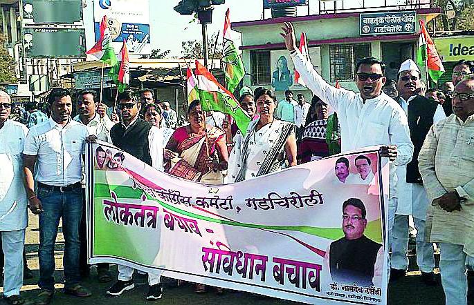 गडचिरोली : जिल्हा काँग्रेस कमिटीच्या वतीने २६ जानेवारीला स्थानिक इंदिरा गांधी चौकात ‘लोकतंत्र बचाओ, संविधान बचाओ’ रॅली काढून भाजप सरकारचा निषेध करण्यात आला.