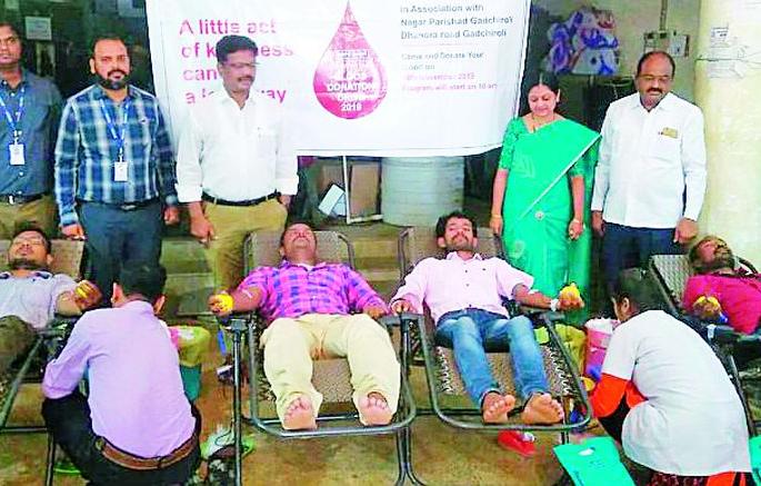 लोकमत न्यूज नेटवर्कगडचिरोली : नगर परिषद गडचिरोली, एचडीएफसी बँक व लाईफ लाईन ब्लड बँक नागपूरच्या संयुक्त विद्यमाने शनिवारी स्थानिक नगर पालिकेच्या कर विभागाच्या सभागृहात रक्तदान शिबिर घेण्यात आले. या शिबिरात नगर परिषद, एचडीएफसी बँक कर्मचारी व सफाई कामगार मिळून एकूण १६ जणांनी रक्तदान करून सामाजिक बांधिलकीचा परिचय दिला.शिबिराचे उद्घाटन नगराध्यक्ष योगीता पिपरे यांच्या हस्ते झाले. यावेळी प्रमुख अतिथी म्हणून मुख्याधिकारी संजीव ओहोळ, नगरसेवक प्रमोद पिपरे, नगरसेविका अल्का पोहणकर, नीता उंदीरवाडे यांच्यासह पालिकेचे विभाग प्रमुख उपस्थित होते.यावेळी नगराध्यक्ष योगीता पिपरे म्हणाल्या, गडचिरोली जिल्ह्यात नेहमी रक्ताची टंचाई भासत असते. जिल्हा सामान्य रुग्णालय, महिला व बाल रुग्णालय तसेच तालुकास्तरावरील रुग्णालयामध्ये विविध आजाराने ग्रस्त रुग्ण मोठ्या संख्येने औषधोपचारासाठी भरती होतात. आधुनिकीकरणामुळे वाहनांची संख्या वाढली असून त्याबरोबर अपघातही वाढले आहे. या अपघातात बरेच लोक जखमी होतात. अशा जखमी व विविध आजाराने ग्रस्त रुग्णांना रक्ताची आवश्यकता भासत असते. सिकलसेल रुग्णांना नियमित रक्त द्यावे लागते. त्यांना रक्त पुरवठा न झाल्यास धोका होण्याची शक्यता असते. त्यामुळे रक्ताचे महत्त्व अनन्य साधारण आहे. त्यामुळे शिबिराच्या माध्यमातून रक्तदान करण्यासाठी प्रत्येकाने पुढे आले पाहिजे, असे आवाहन नगराध्यक्ष पिपरे यांनी यावेळी केले.याप्रसंगी मुख्याधिकारी संजीव ओहोळ व नगरसेवक प्रमोद पिपरे यांनीही आपल्या भाषणातून रक्तदानाचे महत्त्व पटवून दिले. मानवाचे जीवन अमूल्य आहे, आपले रक्त कोणत्याही नागरिकाच्या कामी येऊ शकते, असे त्यांनी सांगितले. शिबिराच्या यशस्वीतेसाठी नगर परिषद, एचडीएफसी बँक तसेच पालिकेच्या नाली सफाई रोजंदारी कामगारांनी सहकार्य केले.