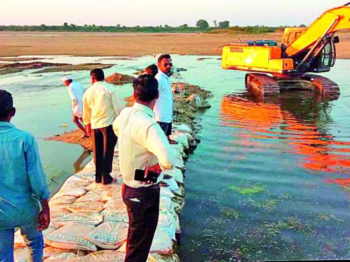 खोलीकरण करून नदीत उभारला बंधारा