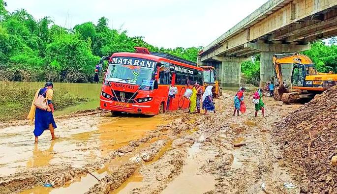 लाेकमत न्यूज नेटवर्कसिरोंचा : सिरोंचा तालुक्यातून जाणाऱ्या राष्ट्रीय महामार्ग क्रमांक ६३ वरील सोमनपल्ली नाल्यावर उभारला जात असलेला पूल अर्धवट स्थितीत आहे. या पुलालगत रहदारीसाठी तयार केलेल्या रस्ता आता सततच्या पावसामुळे चांगलाच चिखलमय झाला आहे. मार्गावर चक्क दोन फुटांपेक्षा जास्त चिखलाचा थर झाल्यामुळे शनिवारी एक प्रवासी बस त्या चिखलात फसली. विशेष म्हणजे दोन दिवसांपूर्वी साखरेच्या गोण्यांनी भरलेला एक ट्रक याच ठिकाणी फसून नाल्याच्या पाण्याच्या प्रवाहाने पाण्यात बुडून गेला होता. त्यात लाखो रुपयांचे नुकसान झाले. मात्र त्यानंतरही प्रशासनाच्या वतीने कोणतीही खबरदारी घेण्यात आली नाही. परिणामी प्रवासी वाहतुकीवर परिणाम होत आहे.शनिवारी एक खासगी प्रवासी बस त्या ठिकाणच्या चिखलात फसली. या भागात तेलंगणा आणि छत्तीसगडमधील प्रवाशांची वर्दळ असते. परंतु राष्ट्रीय महामार्ग प्राधिकरणाच्या ढिसाळ कारभारामुळे या प्रवाशांना फटका बसत आहे.