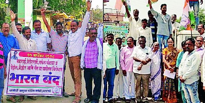 लोकमत न्यूज नेटवर्कचामोर्शी/आष्टी/एटापल्ली : काँग्रेस व मित्र पक्षांनी पुकारलेल्या बंदला चामोर्शी व आष्टी येथे चांगला प्रतिसाद मिळाला.चामोर्शी- महागाई, बेरोजगारी, राफेल घोटाळा, पेट्रोल व डिझेलच्या वाढलेल्या किंमती तसेच गॅस दर वाढीच्या विरोधात भारतीय राष्ट्रीय काँग्रेस तालुका शाखा चामोर्शीच्या पदाधिकाऱ्यांनी चामोर्शी बंदचे आवाहन केले होते. चामोर्शी बंदला चांगला प्रतिसाद मिळाला. लक्ष्मी गेटसमोर भाववाढीच्या विरोधात निदर्शने करण्यात आली. यावेळी काँग्रेसचे तालुकाध्यक्ष विनोद खोबे, जिल्हा महासचिव राजेश ठाकूर, काँग्रेसचे शहर अध्यक्ष तोमदेव पिपरे, तालुका ओबीसी सेलचे अध्यक्ष महेश ऐलावार, सभापती विजय शातलवार, नगरसेवक सुमेध तुरे, कृष्णा नैताम, कालिदास बुरांडे, सुनील जुआरे, बाळकृष्ण बन्सोड, भास्कर चौधरी, नगरसेवक वैभव भिवापुरे, जिल्हा सचिव सुरेश भांडेकर, प्रवीण चन्नावार, नागेश चलकलवार, रमेश चकोर, सुभाष मडावी, गौतम मंडल, रनेल मंडल, शंकर मेकर्तीवार सहभागी होते.आष्टी- जिल्हा परिषद सदस्य रूपाली पंदिलवार, काँग्रेस कार्यकर्ते संजय पंदिलवार यांच्या नेतृत्वात बंद पाळण्यात आला. तसेच निदर्शनेसुद्धा देण्यात आली. यावेळी पं.स.सदस्य शंकर आकरेड्डीवार, विनोद येलमुले, शंकर मारशेट्टीवार, कमला बाबमनवाडे, वर्षा कलाक्षपवार, आनंद कांबळे यांच्यासह काँग्रेस व इतर पक्षांचे कार्यकर्ते हजर होते. निदर्शनादरम्यान पेट्रोल व डिझेल वाढीचा निषेध करण्यात आला. महागाई वाढण्यासाठी केंद्र व राज्य शासन जबाबदार असल्याची टीका करण्यात आली.एटापल्ली- तालुका काँग्रेस कमिटी एटापल्लीच्या वतीने एटापल्ली शहरात बंद पाळण्यात आला. बंदला चांगला प्रतिसाद मिळाला. केंद्र शासनाच्या विरोधात निदर्शने करण्यात आली. यावेळी काँग्रेसचे अध्यक्ष संजय चरडुके, रमेश गम्पावार, रमेश टिकले, किसन हिचामी, निजाम पेंदाम, मोहनम नामेवार, अंकित वरगंटीवार, अरूण तेलकुंटलवार यांच्यासह काँग्रेस कार्यकर्ते हजर होते. तहसीलदारांच्या मार्फत केंद्र व राज्य शासनाला निवेदन पाठविण्यात आले.