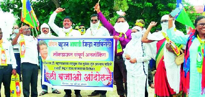 लोकमत न्यूज नेटवर्कगडचिरोली : कोरोना लॉकडाऊनच्या काळात राज्य परिवहन महामंडळाच्या जिल्ह्यांतर्गत मोजक्याच बसफेऱ्या सुरू आहेत. परिणामी सर्वसामान्य नागरिकांना दळणवळणाची समस्या भेडसावत आहे. नागरिकांची गैरसोय दूर करण्यासाठी महामंडळाने एसटी वाहतूक पूर्ववत सुरू करून लॉकडाऊन अनलॉक करावे, या मागणीसाठी वंचित बहुजन आघाडीच्या वतीने बुधवारी येथील बसस्थानकावर बँडमधील डफली वाजवून नारेबाजी केली.या आंदोलनाचे नेतृत्व आघाडीचे जिल्हा प्रभारी बाळू टेंभूर्णे, महासचिव योगेंद्र बांगरे, जी.के.बारसिंगे, गुलाब मुगल, महिला आघाडीच्या माला भजगवडी, धर्मेंद्र गोवर्धन, राजेंद्र बांबोळे यांनी केले.गेल्या २५ मार्चपासून कोरोनाचा प्रादुर्भाव रोखण्यासाठी देशभर अनेक उपाययोजना करण्यात आल्या. सार्वजनिक वाहतूक बंद करण्यात आली. परिणामी सामान्य लोकांची गैरसोय होत आहे. कोरोना विरूद्ध लढण्याची प्रतिकार शक्ती जवळपास ८० टक्के लोकांनी दाखविली आहे. १५ टक्के लोक वैद्यकीय उपचाराला प्रतिसाद देऊन कोरोना मुकाबला करण्यात यशस्वी झाले आहेत. केवळ ५ टक्के लोक प्रतिसाद देत नाही. सरकारने ५ टक्के लोकांसाठी ९५ टक्के लोकांना वेठीस धरणे थांबविले पाहिजे. १०० टक्के लोकांवर निर्बंध घालण्याचे आर्थिक दुष्परिणाम समोर आले आहे. अर्थव्यवस्था संकटात सापडली आहे. या सर्व बाबी लक्षात घेऊन सरकारने तातडीने निर्णय घ्यावे. महामंडळाच्या एसटी सेवा सुरू करून जिल्हा बंदी ताबडतोब उठवावी आदी मागण्या या आंदोलनातून करण्यात आल्या. त्यानंतर तहसीलदार महेंद्र गणवीर यांना शिष्टमंडळाने निवेदन दिले.या आंदोलनात मिलींद बारसागडे, प्रवीणय खोब्रागडे, किशोर फुलझेले, संदीप सहारे, अनिल राऊत, अनिता मडावी, सुनंदा देवतळे, लता शेंद्रे, एन.आर.रामटेके, जगन बन्सोड, अनिल निकुरे, भोजराज रामटेके यांच्यासह वंचित बहुजन आघाडीचे अनेक कार्यकर्ते सहभागी होते.