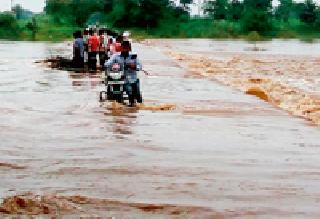 यंदा प्रथमच वाहतूक ठप्प : जीव धोक्यात घालून नागरिक करीत आहेत प्रवासवैरागड : गेल्या चार-पाच दिवसांपासून वैरागड परिसरात पाऊस बरसत आहे. शुक्रवारी रात्री झालेल्या संततधार पावसामुळे वैरागड-मानापूर मार्गावरील वैलाचना नदीच्या पुलावर पाणी वाढले. त्यामुळे शनिवारी सकाळपासूनच सदर मार्ग बंद असून वाहतूक ठप्प आहे. दरम्यान काही नागरिक जीव धोक्यात घालून पाण्यातूनच प्रवास करीत आहेत. वैरागडजवळील वैलोचना नदी पात्रातील पुलाची उंची अतिशय कमी आहे. यामुळे जोरदार पाऊस झाल्यास वैरागड-मानापूर मार्गावरील वाहतूक ठप्प होतो. ही समस्या लक्षात घेऊन या पुलाची उंची वाढविण्यात यावी, अशी मागणी या भागातील नागरिकांनी अनेकदा प्रशासनाकडे लावून धरली. मात्र या पुलाची उंची वाढविण्यास प्रशासनाने पावले उचलली नाही. आघाडी सरकारच्या काळात या पुलाची उंची वाढवून नवीन बांधकाम करण्यासाठी महिनाभर सर्वेक्षण करण्यात आले होते. मात्र त्यानंतर पुढची कार्यवाही झाली नाही. आरमोरीचे आमदार क्रिष्णा गजबे यांनी या मार्गावरील पुलाचे काम मंजूर झाले असल्याची माहिती नागरिकांना दिली होती. गतवर्षी अतिवृष्टीमुळे नऊ वेळा या मार्गावरील वाहतूक बंद होती.मजूर परतल्याने रोवणीचे काम खोळंबलेवैरागड गावात राहणाऱ्या अनेक शेतकऱ्यांची मानापूर भागात शेती आहे. तर पुलापलिकडील काही शेतकऱ्यांची पुलाच्या अलिकडील भागात शेती आहे. नेहमीप्रमाणे अनेक शेतमालक मजूर घेऊन रोवणीसाठी निघाले मात्र वैलोचना नदीच्या पुलावर पूर असल्याने दोन्हीकडील शेतमालक मजुरांसह घरी परतले. परिणामी रोवणीचे काम खोळंबले.