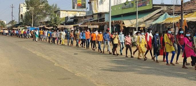 लाेकमत न्यूज नेटवर्कएटापल्ली : नक्षल्यांच्या पीएलजीए सप्ताहानिमित्त २ ते ८ डिसेंबरदरम्यान बंद पाळण्याचे आवाहन धुडकावून लावत येथील नागरिक आणि विद्यार्थ्यांनी भव्य शांतता रॅली काढून आम्हाला हिंसा नको, शांतता आणि विकास हवा, असाच जणू संदेश दिला आहे.एटापल्लीतील उपविभागीय पोलीस अधिकारी कार्यालय ते डॉ. बाबासाहेब आंबेडकर बुद्धविहारपर्यंत ही शांतता रॅली काढण्यात आली. यात भगवंतराव महाविद्यालय व माध्यमिक आश्रमशाळेचे ३०० विद्यार्थी, व्यापारी आणि सर्वसामान्य नागरिक असे ४००पेक्षा अधिक लोक सहभागी झाले होते. या रॅलीमध्ये शाळकरी विद्यार्थ्यांनी काळ्या फिती लावून नक्षलवादी विचारसरणीचा निषेध केला. बुद्धविहार येथे राष्ट्रगीत गाऊन रॅलीचा समारोप करण्यात आला. उपविभागीय पोलीस अधिकारी डॉ. सुदर्शन राठोड यांनी उपस्थित विद्यार्थ्यांना मार्गदर्शन केले. यावेळी पोलीस निरीक्षक विजयानंद पाटील, पोलीस उपनिरीक्षक रविराज कांबळे, प्राचार्य श्यामराव बुटे, मुख्याध्यापक धनंजय पोटदुखे यांच्यासह पोलीस व शिक्षण विभागातील स्टाफ उपस्थित होता. पोलीस अधीक्षक अंकित गोयल यांच्या संकल्पनेतून, अपर पोलीस अधीक्षक (अभियान) सोमय मुंडे, अपर पोलीस अधीक्षक (प्रशासन) समीर शेख, अपर पोलीस अधीक्षक अनुज तारे यांच्या मार्गदर्शनाखाली ही रॅली काढण्यात आली. या रॅलीतून सर्वांनी आम्हाला हिंसा नकाे, शांतता हवी हाच संदेश दिला.