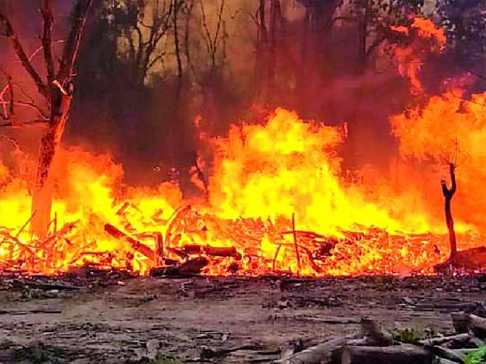 लोकमत न्यूज नेटवर्कआलापल्ली : आलापल्ली वनविभागाअंतर्गत याच वनपरिक्षेत्रातील आलापल्ली येथील खसरा आगाराला भीषण आग लागल्याने या आगीत ५०० पेक्षा अधिक जळाऊ बिट खाक झाल्याची घटना सायंकाळी ४.३० ते ५ वाजताच्या सुमारास घडली.आलापल्ली-एटापल्ली मुख्य मार्गावरील आलापल्लीपासून केवळ एक किमी अंतरावर असलेल्या जवळपास सहा हेक्टर क्षेत्रात पसरलेल्या वन विभागाच्या जळाऊ लाकडाच्या डेपोला आग लागली. या घटनेची माहिती कळताच वनाधिकाऱ्यांसह कर्मचाऱ्यांनी आग आटोक्यात आणण्याचा प्रयत्न केला. मात्र जोरदार वारा असल्याने व सागवानी बिट पूर्णत: सुकले असल्याने आग आटोक्यात येणे अशक्य होते. त्यानंतर वनविभागाने स्वत:कडील पाणी टँकर व अहेरी नगर परिषदेचे अग्निशमन वाहन बोलावून आग विझविण्याचा प्रयत्न केला. दोन जेसीबी लावून लगतचे सागवानी बिट आगीपासून दूर करण्यासाठी उशिरापर्यंत प्रयत्न सुरू होते.घटनास्थळी उपवनसंरक्षक चंद्रकांत तांबे, उपविभागीय वनाधिकारी नितेश देवगडे, वनपरिक्षेत्राधिकारी गणेश लांडगे यांच्यासह कर्मचारी आग विझविण्याच्या कामात व्यस्त होते. या डेपोमधील वनोपजाचा तपशील दर्शक बोर्ड कोरा असल्याने नेमके आकडे मिळू शकले नाही.आग लागली कशी?आग लागण्याचे नेमके कारण कळू शकले नाही. ही आग कशी लागली याचा शोध वनविभाग व पोलीस घेत आहेत. बरेच युवक आईवडिलांपासून लपून-छपून सिगारेट ओढण्यासाठी व गांजा पिण्यासाठी सदर वनडेपोतील बिटाच्या आड बसून राहात असल्याचे दिसून येत आहेत. कुणीतरी जळती सिगारेट कचऱ्यात फेकली असेल तर त्यापासूनही आग लागण्याची शक्यता नाकारता येत नाही, अशी चर्चा सुरू आहे. रात्री बराच वेळपर्यंत आग आटोक्यात आली नव्हती.