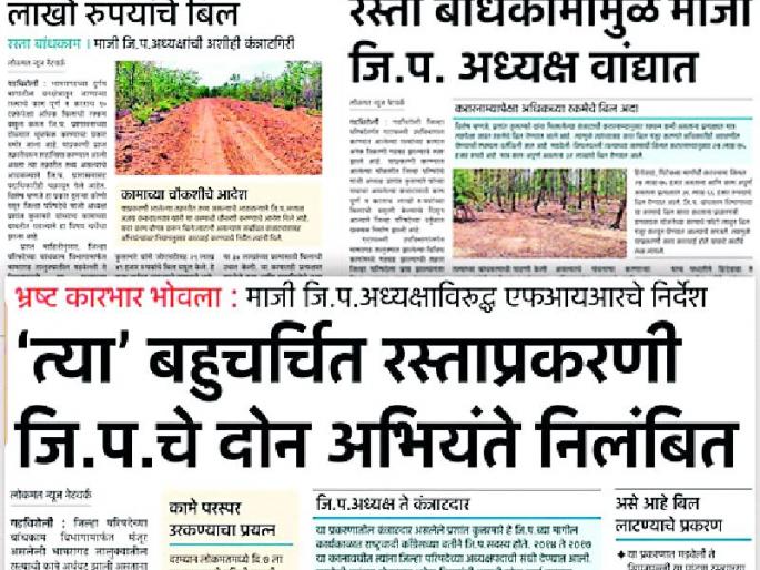 लोकमत न्यूज नेटवर्कगडचिरोली : कामापेक्षा अधिकचे बिल उचलण्याच्या प्रकरणात जिल्हा परिषदेचे माजी अध्यक्ष तथा कंत्राटदार प्रशांत कुत्तरमारे, एटापल्लीचे प्रभारी उपविभागीय अभियंता डब्ल्यू. पी. बोदलवार आणि भामरागडचे कनिष्ठ अभियंता प्रकाश शंखदरबार यांच्या विरोधात भामरागड पोलीस स्टेशनमध्ये रविवारी गुन्हे दाखल करण्यात आले.जिल्हाभरात गाजत असलेल्या या प्रकरणाची तक्रार जिल्हा परिषदेकडे प्राप्त झाल्यानंतर सर्वप्रथम लोकमतने यावरील वृत्त प्रकाशित करून लक्ष वेधले होते.भामरागड तालुक्यातील मडवेली ते सिपनपल्ली तसेच हिंदेवाडा ते पिटेकसा या रस्त्यांची कामे जिल्हा परिषद मार्फत मंजूर करण्यात आली होती. सदर कामांचे कंत्राट माजी जि.प. अध्यक्ष प्रशांत कुत्तरमारे यांना मिळाले होते. मात्र कामे पूर्ण न करताच अधिकच्या बिलाची उचल झाल्याची तक्रार जिल्हा परिषदेला प्राप्त झाली. त्यानुसार जिल्हा परिषदेचे अध्यक्ष अजय कंकडालवार यांनी चौकशी करण्याचे निर्देश दिले. चौकशी समितीने प्रत्यक्ष भेट देऊन पाहणी केली असता, मडवल्ली ते सिपनपल्ली या पांदन रस्त्याचे काम अपूर्ण आढळले. या कामासाठी एकूण २९ लाख ४९ हजार ८०८ रुपयांचे बिल मंजूर करण्यात आले होते. इतर कपात वगळता कंत्राटदाराला २१ लाख ४४ हजार ९६४ रुपयांचे बिल मार्च २०२० मध्ये देण्यात आले. हिंदेवाडा ते पिटेकसा हा रस्ता ८०० मीटर लांबीचा असून त्याचेही काम न करता बिलाची उचल झाली असल्याचे दिसून आले आहे.चौकशी अहवालानंतर जिल्हा परिषदेचे मुख्य कार्यकारी अधिकारी डॉ. विजय राठोड यांच्या निदेर्शानुसार जिल्हा परिषदेचे प्रभारी कार्यकारी अभियंता ललित होळकर यांनी मडवेली-सिपनपल्ली या रस्त्याच्या कामात झालेल्या गैरव्यवहाराबाबतची तक्रार रविवारी भामरागड पोलीस स्टेशनमध्ये दाखल केली. त्यानुसार कंत्राटदार प्रशांत कुत्तरमारे, उपविभागीय अभियंता वामन बोदलवार व कनिष्ठ अभियंता प्रकाश शंखदरबार यांच्या विरोधात भादंवि ४२०, ४०९, ३४, ४६५, ४६७, ४६८, ४७१ अन्वये गुन्हा दाखल केला आहे. या प्रकरणाचा तपास ताडगाव पोलीस मदत केंद्राकडे सोपविला आहे. विशेष म्हणजे, या दोन्ही अभियंत्यांना जिल्हा परिषदेचे मुख्य कार्यकारी अधिकारी यांनी १२ जून रोजी निलंबित केले आहे.