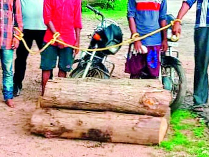 लोकमत न्यूज नेटवर्कसिरोंचा : सिरोंचा-आलापल्ली मुख्य मार्गावर असलेल्या आदीमुत्तापूर गावाजवळ सिरोंचा वनपरिक्षेत्र कार्यालयाच्या पथकाने चार सागवानी लठ्ठे व दोन दुचाकी जप्त करून चार आरोपींना अटक केली. ही कारवाई २७ जुलैच्या पहाटे आली.इशाक बापू दुर्गम (२५), विनोद उर्फ राकेश स्वामी दुर्गम (२५), राजेंद्र बकन्ना दुर्गम (१९), संजयसिंग रामकृपालसिंग राठोड (२९) सर्व रा. सूर्यापल्ली अशी अटक केलेल्या आरोपींची नावे आहेत. सिरोंचा वन परिक्षेत्र कार्यालयाचे पथक रात्रीच्या सुमारास अमडेली जंगल परिसरात गस्त घालत होते. दरम्यान दुचाकीद्वारे सागवानी लाकडे नेली जात असल्याची गोपनिय माहिती पथकाला मिळाली. घटनास्थळ गाठून त्या ठिकाणी आढळून आलेल्या चार इसमांना वन परिक्षेत्र कार्यालय सिरोंचा येथे आणले असता त्यांच्याविरोधात गुन्हा नोंदविण्यात आला. चौकशीसाठी त्यांना जंगलात नेले असता त्यांनी तोडलेल्या झाडांचे थुट दाखविले.घटनास्थळावरून चार नग सागवान लठ्ठे जप्त केले. त्याची किंमत ११ हजार ८१६ रुपये एवढी होते. तसेच कुºहाड, आरी, दोन दुचाकी सुध्दा जप्त केल्या.ही कारवाई सिरोंचाचे वन परिक्षेत्राधिकारी वि.वा. नरखेडकर, क्षेत्र सहायक बी. एम. खोब्रागडे, एल. एम. शेख, बी. एम. नरोटे, वनरक्षक आर. व्ही. जवाजी, डी. जी. भुरसे, पी. डी. कोडाप, एम. जे. धुर्वे, आर. वाय. तलांडी, एस. टी. तुलावी, आर. एस. पदा, वाय. आर. गुणशेट्टीवार यांनी केली.