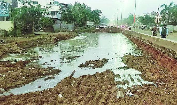 लोकमत न्यूज नेटवर्कगडचिरोली : गेल्या दोन ते तीन दिवसांपासून गडचिरोली शहरातील चामोर्शी मार्गावर राष्ट्रीय महामार्गासाठी खोदकाम सुरू करण्यात आले आहे. येथे दिवसा व रात्री जेसीबीच्या सहाय्याने झपाट्याने खोदकाम केले जात आहे. यादरम्यान मंगळवारच्या रात्री भूमिगत नळ पाईपलाईन फुटल्याने शेकडो लीटर पाण्याचा अपव्यय झाला.चामोर्शी मार्गावरील शासकीय विज्ञान महाविद्यालयाच्या विरूद्ध बाजूने जेसीबीच्या सहाय्याने खोदकाम सुरू करण्यात आले आहे. राष्ट्रीय महामार्ग तयार होत असून सिमेंट काँक्रिटीकरण करण्यात येणार आहे. दरम्यान येथे यंत्राच्या सहाय्याने गतीने खोदकाम सुरू आहे.रस्त्यालगतच्या फुटपाथ दुकानदारांनी आपले अतिक्रमण स्वत:हून काढले. नाक्यापासून ते राधे बिल्डींगपर्यंत रस्त्याचे खोदकाम करण्यात आले असून दुभाजकावर वाहनधारकांसाठी हिरवी जाळी लावण्यात आली आहे. खोदकामादरम्यान बिल्ट आॅफिससमोरील नळ पाईप लाईन फुटली. परिणामी खोदकाम झालेल्या रस्त्यावर मोठ्या प्रमाणात पाणी साचले आहे. खोदकाम झाल्याने लगतच्या आशीर्वाद नगरातील काही घरांचा नळ पाणीपुरवठा प्रभावित झाला आहे. खोदकामामुळे या मार्गावर धुळीचे प्रमाण वाढले असून वाहतूक एकेरी करण्यात आली आहे. एकावेळेस अधिकाधिक चारचाकी वाहने आल्यावर या मार्गावरील वाहतूक प्रभावित होत असल्याचे दिसून येत आहे.