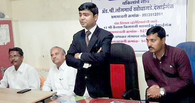 पोलीस ठाण्यात तालुका विधीसेवा समितीच्या वतीने विधीसेवा चिकित्सालय केंद्राचे उद्घाटन बुधवारी न्या. के. आर. सिंघेल यांच्या हस्ते करण्यात आले. याप्रसंगी ते बोलत होते. प्रमुख अतिथी म्हणून उपविभागीय पोलीस अधिकारी शैलेश काळे, देसाईगंज बार असोसिएशनचे अध्यक्ष अॅड. एन. डी. वारजुरकर, सहायक सरकारी वकील एम. के. फुले, अॅड. लाँगमार्च खोब्रागडे, अॅड. अतुल उईके, अॅड. पिलारे, पॅरा लिगल व्हॅलेंटियर प्रा. प्रभाकर गोबाडे, प्रा. कैैलास बडवाईक, अरूण कुंभलवार, प्रा. कहूरके, एपीआय अतुल तवाडे, टारपे उपस्थित होते. संचालन अॅड. लाँगमार्च खोब्रागडे तर आभार अॅड. अतुल उईके यांनी मानले.