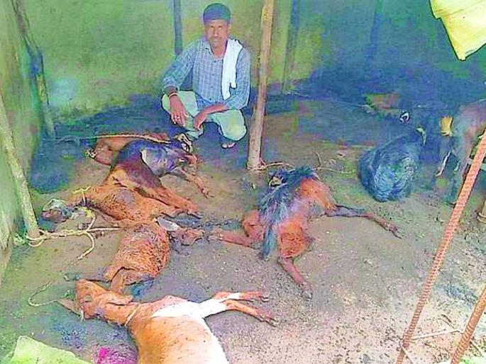 लाेकमत न्यूज नेटवर्ककोरेगाव (चोप) : जंगलातून आलेल्या बिबट्याने गोठ्याची आठ फूट उंच भिंत ओलांडून गोठ्यात बांधलेल्या शेळ्यांवर हल्ला केला. त्यात ११ शेळ्या जागीच ठार झाल्या तर ४ शेळ्या जंगलात पळवून नेण्यात बिबट्याला यश आले. देसाईगंज तालुक्यातील रावणवाडी टोली येथे मध्यरात्री घडलेल्या या घटनेमुळे परिसरातील नागरिकांमध्ये मोठी दहशत पसरली आहे. देसाईगंज तालुक्यातील बोडधा ग्रामपंचायतअंतर्गत रावणवाडी आणि रावणवाडी टोली ही दोन गावे येतात. या दोन गावांत चार किलोमीटरचे अंतर आहे. बुधवारच्या मध्यरात्रीनंतर पहाटेच्या सुमारास प्रभू नैताम यांच्या गोठ्यात बिबट्याने भिंतीवरून प्रवेश केला. यावेळी गोठ्यात बांधून ठेवलेल्या अकरा शेळ्या बिबट्याने ठार केल्या. ४ जंगलात पळवून नेल्या, त्यात तीन बोकडांचा समावेश आहे. हा प्रकार सकाळच्या सुमारास लक्षात आला. या घटनेत प्रभू नैताम यांचे ८० ते ९० हजारांचे नुकसान झाले. त्यांना वनविभागाने नुकसानभरपाई द्यावी, अशी मागणी नागरिकांनी केली आहे. बिबट्याच्या वाढत्या उपद्रवाने कोरेगाव चौक, डोंगरमेंढा टोली परिसरातील नागरिकांमध्ये दहशत वाढली आहे. वनविभागाने योग्य तो बंदोबस्त करावा, अशी मागणी परिसरातून होत आहे.