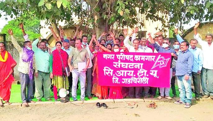 आश्वासन हवेत विरले काय?- शासन निर्णयानुसार कामगारांना किमान वेतन द्यावे, या मागणीला घेऊन मागील महिन्यात कामगारांनी धरणे आंदोलन करून मुख्याधिकाऱ्यांना निवेदन दिले हाेते. तेव्हा किमान वेतन तसेच बँकेमार्फत वेतन देण्याचे आश्वासन मुख्याधिकाऱ्यांनी दिले होते. परंतु महिना उलटूनही त्याची अंमलबजावणी करण्यात आली नाही. मुख्याधिकाऱ्यांचे आश्वासन हवेतच विरले काय? असा सवाल नगरपरिषदेच्या कामगारांनी धरणे आंदाेलनादरम्यान केला.- कामगारांना किमान वेतन न देता त्यांची आर्थिक लुबाडणूक करणाऱ्या कंत्राटदारावर कारवाई का केली जात नाही, असा सवालही कामगारांनी आंदाेलनादरम्यान केला.