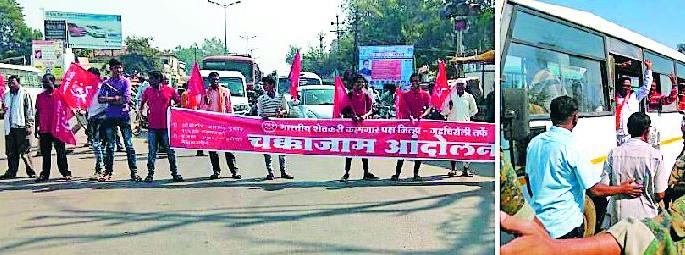 लोकमत न्यूज नेटवर्कगडचिरोली : गडचिरोली जिल्ह्यात इतर मागासवर्गीयांचे आरक्षण १९ वरून ६ टक्के केले ते पूर्ववत १९ टक्के करावे या प्रमुख मागणीसह धानाला ३५०० रुपये हमीभाव आणि इतर स्थानिक मागण्यांसाठी शेतकरी कामगार पक्षाने (शेकाप) बुधवारी जिल्हा मुख्यालयासह गडचिरोली विधानसभा मतदार संघात ११ ठिकाणी चक्काजाम आंदोलन केले. यावेळी पोलिसांनी शेकडो कार्यकर्त्यांना स्थानबद्ध करून नंतर त्यांची सुटका केली.शेकापचे जिल्हा चिटणीस रामदास जराते, महिला नेत्या जयश्री येळदा, पुरोगामी महिला संघटनेच्या जिल्हा सरचिटणीस अर्चना चुधरी, गडचिरोली तालुका चिटणीस सुधाकर आभारे, श्रीधर मेश्राम, श्यामसुंदर उराडे यांच्या नेतृत्वात जिल्ह्यातील हे आंदोलन करण्यात आले.गडचिरोली शहरात इंदिरा गांधी चौकात दुपारी १२ वाजताच्या सुमारास शेकापच्या कार्यकर्त्यांनी जमून घोषणाबाजी केली. त्यानंतर चारही मार्गावरील वाहतूक रोखून धरली. यामुळे अनेक वाहने खोळंबली होती. दरम्यान पोलिसांनी सर्व आंदोलनकर्त्यांना ताब्यात घेऊन पोलीस ठाण्यात स्थानबद्ध केले.गडचिरोली शहरातील आंदोलनापूर्वी काही ठिकाणी सकाळी ९ पासूनच चक्काजाम आंदोलन करण्यात आले. त्यात नागपूर मार्गावरील पोर्ला येथे युवा कार्यकर्ते होमराज उपासे यांच्या नेतृत्वात मंगेश भानारकर, विकास झोडगे, रविंद्र येमगेलवार इतर कार्यकर्त्यांनी, याच मार्गावर नगरी येथे शेकापचे आरमोरी विधानसभा चिटणीस रोहीदास कुमरे, माजी सरपंच मोरेश्वर बांबोळे यांच्या नेतृत्वात जवळपास तासभर आंदोलन झाले.चामोर्शी-मूल मार्गावर रमेश चौखुंडे, दुर्वास म्हशाखेत्री यांच्या नेतृत्वात भेंडाळा येथे सगणापूर, रामाळा, घारगाव, एकोडी, दोटकुली या परिसरातील गावातील कार्यकर्त्यांनी जमून चक्काजाम आंदोलन केले. आष्टी येथे पुरोगामी विद्यार्थी संघटनेचे जिल्हा चिटणीस अक्षय कोसनकर यांच्या नेतृत्वात तर अनखोडा येथे प्रेम कोसनकर यांच्या नेतृत्वात आंदोलन झाले. चामोर्शी येथील मुख्य मार्गावर हत्ती गेटजवळ शेकापचे तालुका चिटणीस दिनेश चुधरी, प्रकाश सहारे अनेक नागरिक या आंदोलनात सहभागी झाले होते.कुनघाडा रै. येथील बस स्थानकावर शेकापचे विधानसभा चिटणीस नरेश मेश्राम, विठ्ठल दुधबळे यांच्या नेतृत्वात बैलबंड्या आडव्या करून चक्काजाम करण्यात आला. यावेळी चामोर्शीचे तहसीलदार बावणे यांनी घटनास्थळी भेट देऊन सदर मागण्या जिल्हा प्रशासनाला कळविण्यात येईल असे आश्वासन दिले.गडचिरोली-चामोर्शी मार्गावरील शिवणी येथे शेकापचे जिल्हा सहचिटणीस वसंत गावतुरे, ओबीसी जागृती अभियानाचे जिल्हा समन्वयक दिनेश बोरकुटे, शेकापचे दत्तू चौधरी यांच्या नेतृत्वात आंदोलन झाले. याशिवाय पोटेगाव मार्गावर गुरवळ