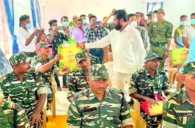 लाेकमत न्यूज नेटवर्कभामरागड : राज्याचे नगर विकास, सार्वजनिक बांधकाम (सार्वजनिक उपक्रम) मंत्री तथा गडचिरोली जिल्ह्याचे पालकमंत्री एकनाथ शिंदे यांनी भामरागड तालुक्यातील अतिदुर्गम भागातील पोलिसांची भेट घेऊन घेऊन त्यांना दिवाळी भेट दिली. नक्षलदृष्ट्या अतिसंवेदनशील असलेल्या त्या धोडराज पोलीस मदत केंद्रातील पालकमंत्र्यांच्या या भेटीने पोलीस जवान भारावून गेले.विशेष म्हणजे नक्षल्यांकडून शिंदे यांना धमकीपत्र आले आहे. पण त्याला न जुमानता नक्षलविरोधी अभियानात कर्तव्यावर असलेल्या पोलिसांची हिंमत वाढवून त्यांच्यासोबत दिवाळी साजरी करण्यासाठी शिंदे शनिवारी मुंबईतून आले. गडचिरोलीतून पोलिसांच्या हेलिकॉप्टरने भामरागड तालुक्यातील धोडराज पोलीस मदत केंद्रावर पोहोचून तेथील पोलीस जवानांशी संवाद साधला. यावेळी त्यांनी स्वत: तेथील जवानांना मिठाईचे पॅकेट देऊन दिवाळीच्या शुभेच्छा दिल्या.यावेळी पोलीस उपमहानिरीक्षक संदीप पाटील यांनी गडचिरोली पोलीस दलाच्या ‘पोलीस दादालोरा खिडकी’या उपक्रमाचे कौतुक केले. यावेळी मार्गदर्शन करताना पोलीस अधीक्षक अंकित गोयल यांनी पोलीस दादालोरा खिडकीच्या माध्यमातून जिल्ह्यातील युवक-युवतींना रोजगार व स्वयंरोजगाराच्या अनेक संधी उपलब्ध करून त्यांना आत्मनिर्भर होण्यासाठी मदत केली जात असल्याचे सांगितले. यावेळी जिल्हाधिकारी संजय मीना यांच्यासह इतर अधिकारी उपस्थित होते.