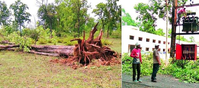 वादळामुळे वीज तारांवर झाडांच्या फांद्या कोसळल्या. परिणामी वीज तारा तुटल्याने भामरागड शहराचा संपूर्ण वीज पुरवठा खंडित झाला होता. स्थानिक वीज कर्मचाऱ्यांनी वीज पुरवठा सुरळीत करण्यासाठी प्रयत्न सुरू केले. तीन ते चार तास तुटलेल्या वीज तारा जोडण्याचे काम वीज कर्मचाºयांनी केले. भामरागड येथील विश्वेश्वरराव चौक व मुस्लिम टोला भागात वीज पुरवठा सुरू करण्यात आला. मात्र अंधार पडल्याने इतर भागातील वीज दुरूस्तीचे काम बंद करावे लागले.