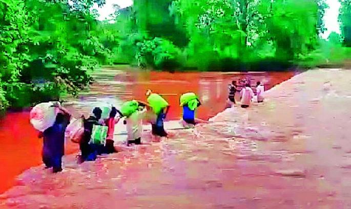 लोकमत न्यूज नेटवर्कगडचिरोली : सोमवारपासून अनेक भागात पाऊस ओसरल्याने जिल्ह्यातील पूरपरिस्थिती नियंत्रणात आहे. मात्र झिंगानूर-रोमपल्ली, आसरअल्ली-सोमनपल्ली यासह काही मार्ग बंदच आहेत. काही भागात घरांची पडझड झाली. त्याचे पंचनामे करणे सुरू आहे. अद्याप कुठेही पाऊस किंवा पूरपरिस्थितीमुळे जीवित हानी झाल्याचे वृत्त नाही.मागील तीन दिवसात सर्वाधिक पाऊस भामरागड तालुक्यात व छत्तीसगड राज्यात झाल्याने भामरागड तालुक्यातील पर्लकोटा, इंद्रावती व पामुलगौतम या नद्यांची पाणीपातळी वाढली होती. पर्लकोटाचे पाणी भामरागडमध्ये शिरले होते. सोमवारी गावातील पाणी ओसरले, मात्र पुलावरून पाणी वाहात होते. मंगळवारी पहाटेच्या सुमारास पुलावरीलही पाणी ओसरले. त्यामुळे हा मार्ग आता सुरू झाला आहे. इंद्रावती, पर्लकोटा, गोदावरी, प्राणहिता, वैनगंगा या नद्यांची पाणीपातळी कमी झाली आहे. गोसेखुर्द धरणाचे ३१ दरवाजे अर्धा मीटरने उघडले आहेत. मेडिगड्डा बॅरेजचे ६५ दरवाजे उघडण्यात आले आहेत. त्यामुळे गोदावरी नदीतून पाण्याचा विसर्ग अधिक सुरू आहे.दरम्यान मंगळवारी सकाळी घेतलेल्या नोंदीनुसार २४ तासात जिल्ह्यात सरासरी २३.६ मिमी पाऊस झाला. त्यात सर्वाधिक ६९.२ मिमी पाऊस अहेरी तालुक्यात झाला आहे. भामरागड तालुक्यात ५२.२ मिमी पाऊस झाला आहे. अहेरी तालुक्यात आतापर्यंत १२३३ मिमी पाऊस झाला आहे. हा पाऊस आतापर्यंत पडणाºया सरासरी पावसाच्या तुलनेत १३८ टक्के आहे.भामरागड तालुक्यात १२४७ मिमी पाऊस झाला असून तो सरासरीच्या तुलनेत १२४.८ मिमी आहे. सिरोंचा आणि मुलचेरा तालुक्यातही सरासरीच्या तुलनेत जास्त पाऊस झाला आहे. मात्र धानोरा, कोरची, देसाईगंज तालुक्यात पाऊस पुरेशा प्रमाणात बरसलेला नाही. जिल्ह्यातील केवळ चार तालुक्यात सरासरीएवढा पाऊस झाला आहे.जुवी नाल्यावरून धोकादायक प्रवासभामरागड : जुवी नाल्यावर अत्यंत कमी उंचीचा रपटा तयार करण्यात आला आहे. या रपट्यावरून तीन फूट पाणी वाहात असताना परिसरातील काही नागरिक डोक्यावर सामानाचे ओझे घेऊन प्रवास करीत असल्याचे चित्र मंगळवारी पहायला मिळाले.भामरागड तालुका मुख्यालयापासून जुवी नाला जवळपास ८ किमी अंतरावर आहे. या नाल्याच्या पलिकडे २० ते २५ गावे आहेत. या गावांना दैनंदिन वस्तू खरेदीसाठी तसेच प्रशासकीय कामासाठी भामरागड येथे यावे लागते. एका स्वयंसेवी संस्थेने या नाल्यावर रपटा तयार केला आहे. मात्र या रपट्याची उंची कमी आहे. भामरागड तालुक्यात तीन दिवसांत जोरदार पाऊस झाला. या पावसामुळे जुवी नाला ओसंडून वाहात होता. पावसादरम्यान काही नागरिक कामानिमित्त भामरागड येथे आले. मात्र पावसामुळे नाल्याचे पाणी वाढल्याने ते अलिकडेच अडकून पडले. मंगळवारी पाण्याचे प्रमाण कमी झाले. म