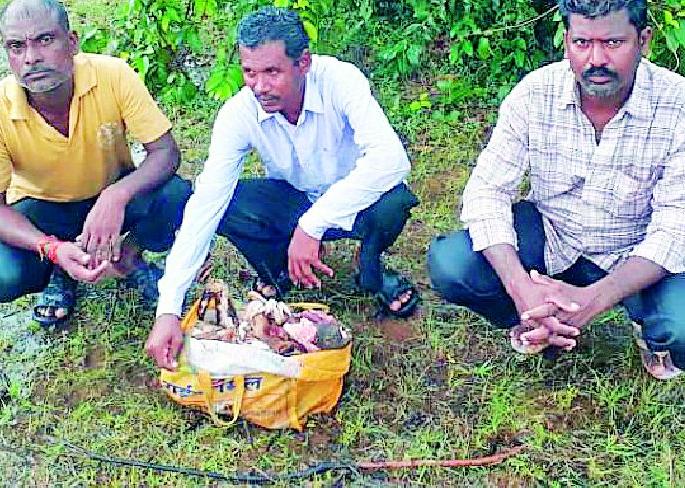 हेमराज प्रभू कोराम रा. नान्ही, अशोक आत्माराम कोरेटी, मोहन सोनसाय घाटघुमर दोघेही रा. आंजनटोला अशी अटक करण्यात आलेल्या आरोपींची नावे आहे. कुरखेडाचे क्षेत्र सहायक शिवशंकर कायते व वडेगावचे वनरक्षक राजेंद्र पाटील, नितूपालन नाकाडे हे जंगलात गस्तीवर असताना सिमेंट बंधाऱ्यावर तीन अज्ञात इसम संशयास्पद आढळून आले. तिथे जाऊन पाहणी केले असता, बंधाऱ्याच्या पायऱ्यांवर मांस आढळून आले. सदर मांस कशाचे आहे, असे शिकार करणाऱ्यांना विचारले असता, त्यांनी सदर मांस भेडकीचे असल्याचे सांगितले. याबाबतची माहिती वन परिक्षेत्राधिकारी सुनील सोनटक्के यांना देण्यात आली.