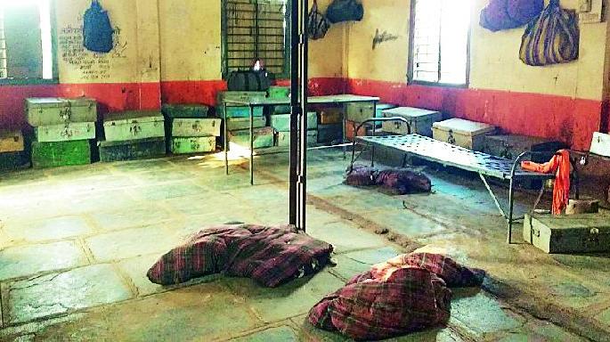 खोलीच्या दोन्ही बाजूला पाणी साचले आहे. या साचलेल्या पाण्यातूनच मार्ग काढत रेस्टरूमपर्यंत पोहोचावे लागते. रेस्टरूमचा परिसर कधीच झाडला जात नाही. त्यामुळे या परिसरात चिखल निर्माण झाले आहे. पावसाच्या पाण्यासोबत वाहत आलेल्या पाण्याच्या बॉटलचा खच पडला आहे. मागील महिनाभरापासून साचून असलेल्या पाण्यात कचरा कुजल्याने दुर्गंधी येत आहे.