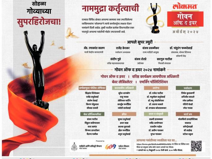 या सोहळ्यात पोलिस खाते, प्रशासन, आरोग्य, पर्यावरण, फलोत्पादन, क्रीडा, कला व संस्कृती या क्षेत्रात अतुलनीय कार्य करणाऱ्या कर्तृत्ववान गोमंतकीयांना पुरस्कार दिले जातील. त्यासाठी या प्रत्येक क्षेत्रात पाच नामांकने लोकमतने जाहीर केली आहेत. त्यांना आज सोमवारी सायंकाळी ४ वाजेपर्यंत वाचकांना मत देता येईल. त्याशिवाय एक वरिष्ठ आयपीएस अधिकारी, बेस्ट लेजिस्लेटर, एमर्जिंग पॉलिटिशियन यांची एकमताने निवड करून त्यांना गौरविले जाणार आहे.