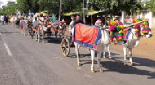 बैलबंडीवर वरात : सध्या महाराष्ट्र दुष्काळी परिस्थितीत होरपळत आहे. अशा स्थितीत पैशाची बचत करण्याचा व साधेपणाने विवाह करण्याचा निर्धार केलेल्या लाखांदूर येथील छगन राऊत या तरुण शेतकऱ्याने अशी बैलबंडीवर वरात काढून गावकऱ्यांचे लक्ष वेधले.