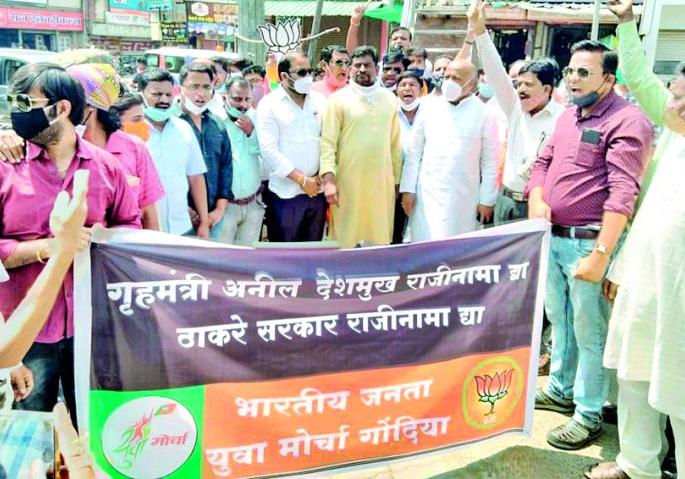 लोकमत न्यूज नेटवर्कगोंदिया : महाराष्ट्राचे गृहमंत्री आणि गोंदियाचे पालकमंत्री अनिल देशमुख यांच्यावर मुंबईचे माजी पोलीस आयुक्त परमबीरसिंग यांनी आरोप करीत त्यासंबंधीचे पत्र मुख्यमंत्री उद्धव ठाकरे यांना पाठविले. या लेटरबाॅम्बनंतर राज्यातील राजकारण ढवळून निघाले. या प्रकरणावर महाराष्ट्र सरकार पांघरूण घालण्याचा प्रयत्न करीत आहे, असा आरोप करीत गृहमंत्र्यांनी राजीनामा द्यावा, अशी मागणी भाजपने केली. तसेच या विरोधात रविवारी सकाळी शहरातील जयस्तंभ चाैकात निदर्शने करण्यात आली. भारतीय जनता युवा मोर्चाच्यावतीने गृहमंत्र्यांनी राजीनामा द्यावा, महाराष्ट्र सरकार भ्रष्टाचारी असे विविध नारे लावत महाविकास आघाडी सरकारचा निषेध नोंदविला. गोंदिया शहरातून निषेध मोर्चा काढण्यात आला. हा मोर्चा महात्मा गांधी चौकात पोहचला. या चौकात निदर्शने करून मोर्चाची सांगता करण्यात आली. मोर्चा सुरू झाला त्यावेळी शहर पोलिसांनी त्यांना अडविण्याचा प्रयत्न केला होता. यावर पत्रकारांनी भाजपच्या पदाधिकाऱ्यांना विचारणा केली असता माजी आमदार गोपालदास अग्रवाल यांनी याला दुजोरा देताना सांगितले की भाजपच्या कार्यकर्त्यांनी परवानगी न घेता मोर्चा काढल्यामुळे पोलिसांनी माेर्चा अडविला होता. कोविडची साथ सुरू असल्यामुळे माेर्चा काढू नये असे पोलिसांनी भाजपच्या कार्यकर्त्यांना सांगितले. परंतु यात चर्चा करून मार्ग काढण्यात आल्याचे सांगितले. या मोर्चात माजी आमदार गोपालदास अग्रवाल, नगरसेवक राजकुमार कुथे, संजय कुळकर्णी, धनलाल ठाकरे व इतरांचा समावेश होता.