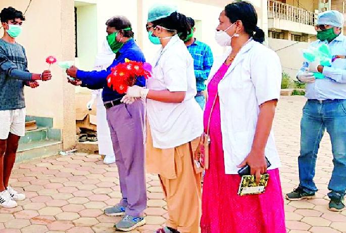 गोंदिया क्रीडा संकुलातील कोविड केअर सेंटरमधील आयसोलेशन कक्षात जिल्ह्यातील सर्व कोरोना बाधीत रुग्णांवर मागील आठ ते दहा दिवसांपासून उपचार सुरू आहे. जिल्ह्यात दररोज कोरोना बाधीत रुग्णांच्या संख्येत वाढ होत असल्याने या कोविड केअर सेंटरमध्ये कार्यरत डॉक्टर आणि आरोग्य कर्मचाऱ्यांवरील ताण सातत्याने वाढ आहे. मात्र शुक्रवारी येथील तब्बल २५ कोरोना बाधीत रुग्ण कोरोनामुक्त झाल्याने त्यांना कोविड केअर सेंटरमधून सुटी देण्यात आली. त्यामुळे सदैव तणावाखाली असलेल्या सेंटरमधील वातावरण काहीसे आनंदायी होते. डॉक्टर आणि परिचारिकांनी सुध्दा कोरोनामुक्त झालेल्यांचे पुष्षगुच्छ देऊन आणि टाळ्या वाजवून निरोप दिला.