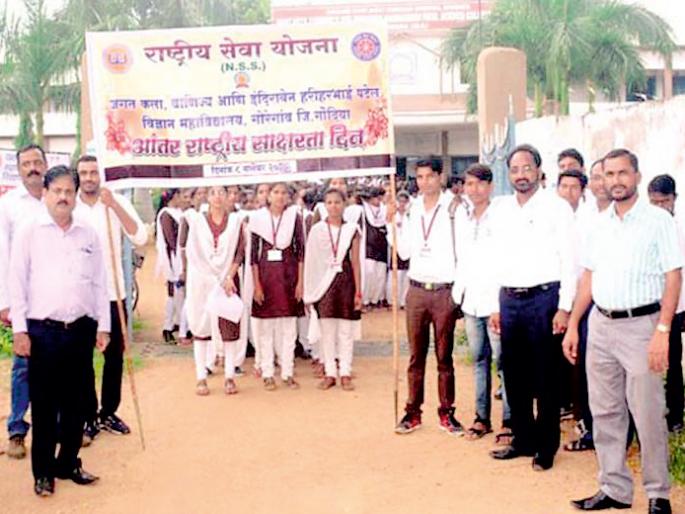 आंतरराष्टÑीय साक्षरता दिनानिमित्त जगत कला, वाणिज्य व इंदिराबेन हरिहरभाई पटेल विज्ञान महाविद्यालयातील राष्टÑीय सेवा योजनातर्फे प्राचार्य डॉ.एन.वाय. लंजे व उपप्राचार्य डॉ.एस.एच.भैरम यांच्या मार्गदर्शनात
