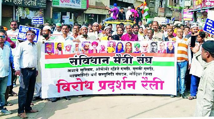 लोकमत न्यूज नेटवर्कगोंदिया : मुस्लीम समाजाबांधवासह इतर समाजाबांधवानी नागरिकता संशोधन कायद्याच्या विरोधात शनिवारी (दि.२१) उपविभागीय कार्यालयावर मोर्चा काढला. शहरातील मुख्य मार्गावरुन हा मोर्चा जयस्तंभ चौकातील उपविभागीय कार्यालयावर पोहचला. येथे मोर्चाचे रुपांतर सभेत झाले. मान्यवरांनी मोर्चाला संबोधित केल्यानंतर विविध मागण्यांचे निवेदन उपविभागीय अधिकाऱ्यांना देण्यात आले.केंद्र सरकारच्या विरोधात काढण्यात आलेला मोर्च्यात अनेक समाजातील संघटनांनी एकत्र येऊन आपण एकत्र आणि भारतीय संविधानाला माणणारे आहोत असा संदेश दिला. उपविभागीय कार्यालयासमोरील रस्त्यावर पेंडाल टाकून विविध समाजाच्या पुढाऱ्यांनी भाषणे दिली. केंद्र सरकारच्या भुमिकेवर जोरदार टिका केली. या मोर्च्याला संविधान बचाव असे नाव देण्यात आले आहे. संविधानाच्या रक्षणासाठी आम्ही मोर्च्याचे आयोजन केले आहे. आमचा नागरिकता संशोधन कायद्याला तिव्र विरोध आहे. हा कायदा देश तोडणारा कायदा आहे. सरकार असले कायदे आणून संविधानाचे अस्तीत्व संपविण्याचा प्रयत्न करीत आहे. भारतीय संविधानाने सर्वांना समानतेचा अधिकार दिला. संविधानाची मोडतोड करून देशात भेदाभेद निर्माण करू नये, मात्र सरकारने नागरिकता संशोधन कायदा पारीत करून सरकार देशातील बंधुत्व भाव संपवित आहे. या कायद्याच्या विरोधात संपूर्ण देश आहे. त्यामुळे या कायद्याला रद्द करण्याची मागणी मोर्चेकºयांनी केली. सदर मोर्चा संविधान मैत्री संघ,अवामे मुस्लीम गोंदिया जिल्हा, ओबीसी, व्हीजे एनटी, एससी, एसटी, मुस्लीम अल्पसंख्याकांनी महाविरोध मोर्चा काढला.उपविभागीय कार्यालयासमोरील डॉ. बाबा साहेब आंबेडकर यांच्या प्रतिमेला माल्यार्पण करून आंबेकडर चौकातून मोर्चा जयस्तंभ चौक, होत नेहरू चौक, गोरेलाल चौक, पोलीस ठाणे मार्ग होत गांधी प्रतिमा चौक होत जयस्तंभ चौकात नेण्यात आला.नागरिकता संशोधन कायद्याला रद्द करण्यात यावे या मागणीचे निवेदन राष्टÑपती रामनाथ कोविंद यांच्या नावे उपविभागीय अधिकाºयांना देण्यात आले.मोर्च्यात संयोजक अतुल सतदेवे, सतीश बन्सोड, बबलू कटरे, रवी भांडारकर, सुनील भोंगाडे, सुनील पटले, सविता बेदरकर, पोर्णिमा नागदेवे, सुनील भालेराव, विनोद नांदूरकर, गुड्डू हुसेनी, जाकीर अली, सईम कुरेशी, मोहसीन खान, अहमद जावेद दरजा, अफजल शाह, अतीशार रहमान, मोसमी खान, मुजीब खान, फरान गोदुली, अकरम खा पठाण, मो.अनिष खान, जावेद रकाउद्दीन, परवेज शेख, शकील मन्सूरी, ईर्शाद शेख, मो.अतीन कुरेशी, मो. खालीद पठाण, आसीफ सैय्यद, अहमद मनिहार, मो.जलील खान, रिवान खान, एव्हरेस्ट डहाट, अमर खान, युनुस खान, आसीफ पेन्टर, मेहहाब खान, नईम, जमील खान, प्रशांत डोंगरे व इतर सहभागी झाले होते.पोलिसांचा चोख ब