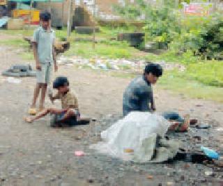 पोटासाठी : सडक अर्जुनी येथे पाटे विकणारे लोक आले आहेत. पोट भरण्यासाठी एका गावावरुन दुसऱ्या गावी जाऊन दगडाला आकार देऊन पाटे व वरवंटे तयार करुन विकण्याचा या लोकांचा व्यवसाय आहे. आपल्या वडिलांच्या व्यवसायाला मदत करण्याचे काम हा चिमुकला करीत आहे.