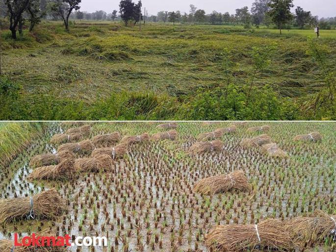 जिल्ह्यात खरीप हंगामात १ लाख ९६ हजार हेक्टरवर धानपिकाची लागवड करण्यात आली. यात सर्वाधिक १ लाख हेक्टरवर हलक्या धानाचे क्षेत्र आहे. सध्या खरीप हंगामातील हलक्या धानाची कापणी जवळपास ८५ टक्के झाली आहे. तर काही शेतकऱ्यांची मळणी सुरू आहे. जड धान निघण्यास अजून पंधरा ते वीस दिवसांचा कालावधी शिल्लक आहे. अशात बुधवार आणि गुरुवारी जिल्ह्यात झालेल्या अवकाळी पावसाने कापणी केेलेल्या आणि शेतातील उभ्या धानपिकाची दाणादाण केली. अनेक शेतकऱ्यांच्या शेतातील कापणी केलेल्याधानाच्या कडपा भिजल्या तर बांध्यामध्ये पाणी साचल्याने मोठ्या प्रमाणावर धानपिकाचे नुकसान झाले. तर वादळी पावसामुळे शेतातील उभे धान झोपल्याने शेतकऱ्यांचा तोंडचा घास हिरावला आहे. तर अवकाळी पावसाच्या तावडीत धानपिके वाचविण्यासाठी शेतकऱ्यांच कुटुंबीयांसह केविलवाणी धडपड सुरू आहे.