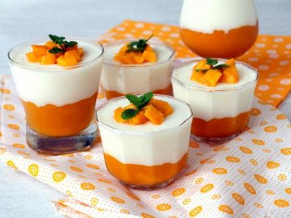 एकाबाऊलमध्ये ओतून फ्रीजमध्ये ४ ते ५ तास थंड करावे. सर्व्ह करताना त्यावर कापलेले आंब्याचे तुकडे आणि पुदिन्याच्या पानांनी गार्निश करावे.