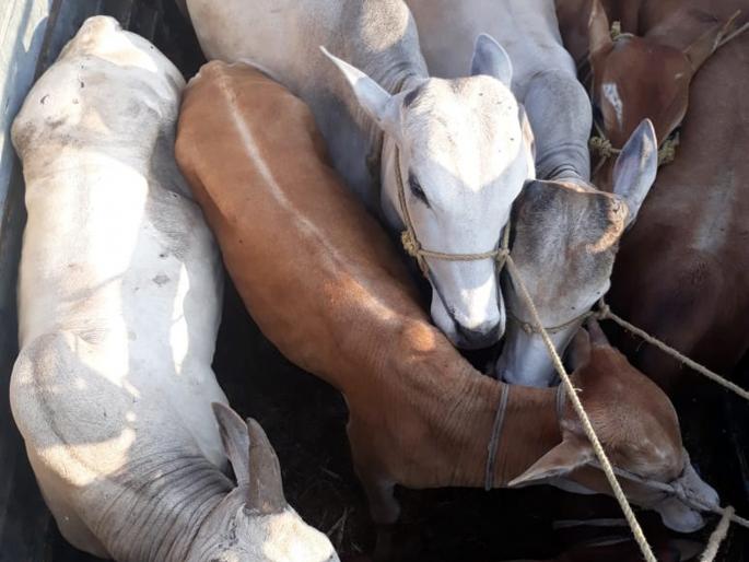 लोकमत न्यूज नेटवर्कहिंगोली : शहरालगतच्या अकोला बायपास परिसरातून कत्तलीसाठी जनावरे घेऊन जाणारा ट्रक पकडल्याची घटना २५ नोव्हेंबर रोजी दुपारी १.३० वाजेच्या सुमारास घडली.सविस्तर माहिती अशी की, हिंगोली शहर परिसरातील बळसोंड भागातील बायपास येथून कत्तलीसाठी जनावरे घेऊन जाणारे दोन वाहन शिवसेनेचे शहरप्रमुख अशोक नाईक व त्यांच्या सहकार्यांनी पकडले. यावेळी वाहनात जनावरे कोंबून ठेवण्यात आले होते. एक पिकअप हिंगोली ग्रामीण ठाण्यात आणुन उभे करण्यात आले आहे. यात ८ जनांवरे होती. तर दुसऱ्या वाहनांतही सात ते आठ जनांवरे होती. परंतु एक वाहनचालक पळून गेला आहे. पकडण्यात आलेले पिकअप ठाण्यासमोर उभे करून अशोक नाईक फिर्याद देत होते. यावेळी वाहन क्रमांक एचएच-३०-एबी-७२ चा चालकही फरार झाला. याप्रकरणी दोन्ही चालकाविरूद्ध अशोक नाईक यांच्या फिर्यादीवरून विविध कलमान्वये हिंगोली ग्रामीण ठाण्यात गुन्हा दाखल करण्यात आला आहे. तपास पोना आर. एस. हरकाळ करीत आहेत.कत्तलीसाठी गुरे घेऊन जाणारे वाहने अशोक नाईक, गणेश शिंदे, राजू आमुलवार, गोपाल अग्रवाल, दीपक डोरले, भुसांडे आदींनी पकडली. गुरांना गोशाळेत पाठविण्यात आले आहे. बायपास परिसरातून कत्तलीसाठी घेऊन जाणारे वाहने पकडण्यात आल्याने जनावरांना जीवदान मिळाले.