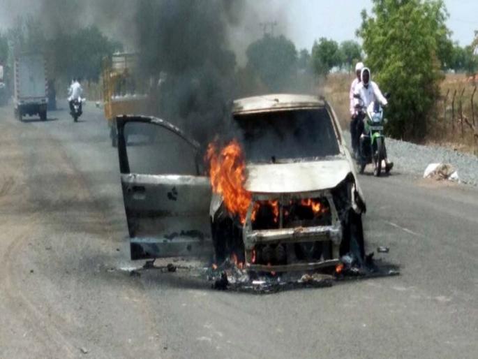 याबाबत अधिक माहिती अशी कि, आज दुपारी साडेबाराच्या सुमारास उन्हाचा कडाका वाढलेला असताना परभणी रोडवर खांडेगाव शिवारात एक धावती कार पेटलेली काही वाहनचालक व ग्रामस्थांना दिसली. आगीचा भडका उडाल्याने कारमध्ये कोणी असेल अशी समजूत सर्वांची झाली. नागरिकांनी ताबडतोब बीट जमादार निवृत्ती बडे यांना मोबाईलवर माहिती दिली. जमादार निवृत्ती बडे, मारोती भुरके अग्निशाक दलासह घटनास्थळी दाखल झाले. आग विझवली असता कारमध्ये कोणी आढळले नाही. चालक घाबरलेल्या अवस्थेत आग लागताच बाहेर आला व खासगी दवाखान्यात रवाना झाल्याचे ग्रामस्थांनी पोलिसांना सांगितले. आगीत कार जळून खाक झाली. मात्र सदर कारच्या जळीत प्रकरणाची नोंद किंवा तक्रार द्यायलाही सायंकाळपर्यंत कोणी ग्रामीण पोलीस ठाण्यात आले नव्हते. त्यामुळे कारचा मालक कोण व आग कशी लागली हे कोडे कायमच आहे. कारचा नंबर ही जळाल्याने कारबाबत अधिक माहिती समजू शकली नाही.