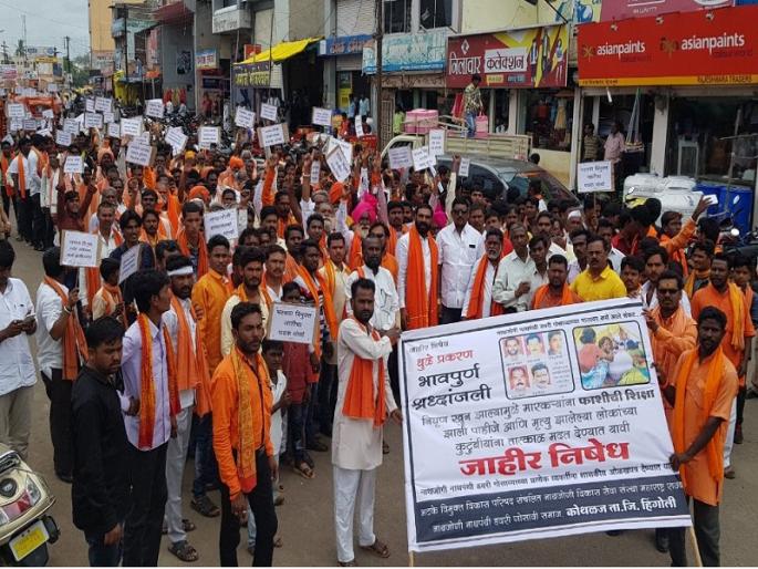 हिंगोली : धुळे जिल्ह्यातील राईनपाडा गावात पाच जणांच्या हत्येच्या निषेधार्थ आज सकाळी १०.३० वाजता नाथजोगी समाजाचा मोर्चा हिंगोली जिल्हाकचेरीवर धडकला. भटक्या जमातीतील व्यक्तीवर दिवसेंदिवस अत्याचार वाढत आहेत, त्यामुळे समाजाच्या सुरक्षा द्यावी,तसेच राईनपाडा घटनेतील आरोपींना फाशीची शिक्षा द्यावी अशी मागणी यावेळी करण्यात आली.