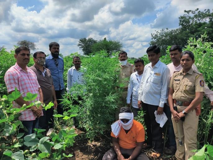 हिंगोली : जिल्ह्यातील उमरा (ता.औंढा) येथील एका शेतात कपाशीच्या क्षेत्रात आंतरपिक म्हणून केलेल्या गांजाच्या शेतीवर पोलिसांनी शनिवारी सकाळी ११ वाजेच्या सुमारास धाड टाकली. याप्रकरणी तिघांना अटक करण्यात आली आहे.
