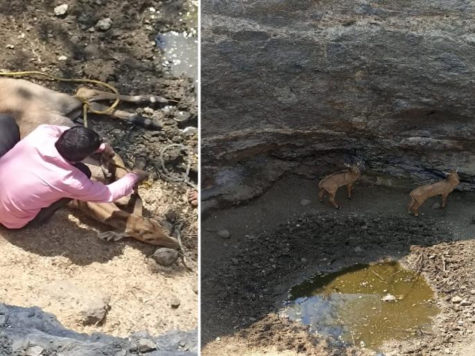 ३० फूट विहिरीत सोडली दोरी...निलगायीचे वासरे विहिरीत पडल्याचे कळताच शेतकरी जमा झाले. परंतु, या वासरांना बाहेर कसे काढावे? हा प्रश्न सर्वांना सतावत होता. दरम्यान, काही शेतकऱ्यांनी ३० फुट विहिरीत दोरी सोडली. या दोरीच्या सहाय्याने शेतकरी कमी प्रमाणात पाणी असलेल्या विहिरीत उतरले. त्यानंतर त्यांनी दोरी वासरांना बांधून अलगदपणे बाहेर काढून जीवदान दिले. शेतकऱ्यांनी धाडस दाखवून निलगायीच्या दोन्ही वासरांना जसे बाहेर काढले. तसे वन विभागाने या वन्यप्राण्यांसाठी धाडस दाखवून पाणवठे तयार करावेत, असे शेतकरी म्हणत होते.
