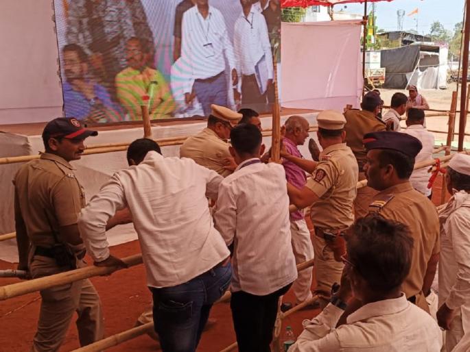 हिंगोली : राष्ट्रीय महामार्ग १६१ च्या चौपदरीकरणात सीमांकनाबाहेरील जमिनी दाखवून काहींना मावेजा दिला तर पोटखराब जमिनी गहाळ करून मावेजा दिला नसल्याचा आरोप करीत वाशिम जिल्ह्यातील एका शेतकऱ्याने हिंगोली येथे केंद्रीय रस्ते वाहतूक व राष्ट्रीय महामार्ग मंत्री नितीन गडकरी यांच्या सभेत गोंधळ घातला.